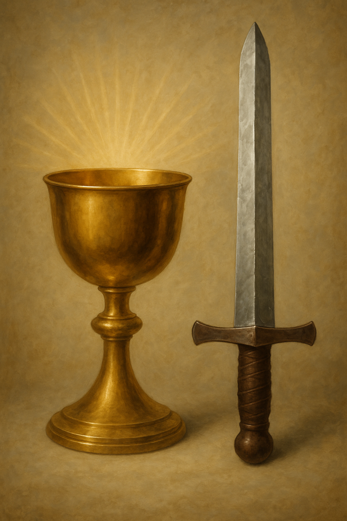 O cálice e a espada continuam diante de nós. Podemos escolher qual símbolo guiará nossas relações. A espada é rápida, cortante, sedutora. O cálice exige paciência, cuidado, tempo. A espada promete vitória, mas deixa rastros de sangue. O cálice não promete domínio, mas oferece comunhão. Entre cortar e nutrir, entre dividir e integrar, está a encruzilhada da humanidade.